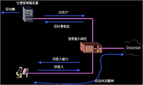 當(dāng)用戶(hù)選擇上網(wǎng)后。管理人員首先通過(guò)計(jì)費(fèi)管理服務(wù)器為用戶(hù)開(kāi)戶(hù)。出用戶(hù)在打開(kāi)瀏覽器試圖訪(fǎng)問(wèn)Internet時(shí)會(huì)彈來(lái)自接入網(wǎng)關(guān)要求登入的窗口。用戶(hù)輸入用戶(hù)名、密碼并可以選擇適合自己的資費(fèi)方式。輸入信息后接入網(wǎng)關(guān)將信息交由計(jì)費(fèi)管理服務(wù)器處理。計(jì)費(fèi)管理服務(wù)器驗(yàn)證通過(guò)后,向該用戶(hù)開(kāi)放互聯(lián)網(wǎng)出口。在用戶(hù)訪(fǎng)問(wèn)互聯(lián)網(wǎng)的同時(shí),接入網(wǎng)關(guān)計(jì)錄下該用戶(hù)訪(fǎng)問(wèn)互聯(lián)網(wǎng)的相關(guān)信息,其中包括訪(fǎng)問(wèn)的時(shí)長(zhǎng)和數(shù)據(jù)流量。接入網(wǎng)關(guān)實(shí)時(shí)地向計(jì)費(fèi)管理服務(wù)器更新用戶(hù)的計(jì)費(fèi)信息,用戶(hù)斷網(wǎng)后計(jì)費(fèi)管理服務(wù)器計(jì)算用戶(hù)上網(wǎng)費(fèi)用。