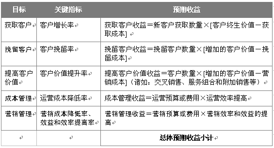 "效益目標(biāo)" 這一戰(zhàn)略考慮是設(shè)定企業(yè)客戶關(guān)系管理戰(zhàn)略中的針對細分客戶的收益目標(biāo),與之相關(guān)聯(lián)的戰(zhàn)略重點是最大化針對細分客戶的客戶價值。這一部分將對以后工作中的客戶關(guān)系管理客戶收益提供方向和評估方法。