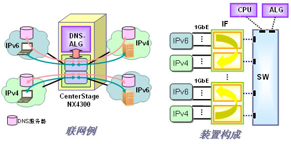 可以在ALG 刀片上搭載將DNS咨詢進(jìn)行IPv6-IPv4轉(zhuǎn)換的ALG功能。與轉(zhuǎn)換服務(wù)器刀片協(xié)作可以實現(xiàn)IPv6與IPv4的雙方向通信。