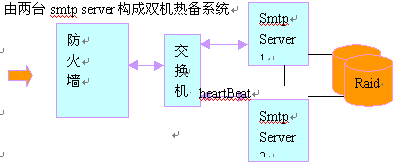 2. 2個(gè)smtp server可以構(gòu)成負(fù)載均衡,同時(shí)構(gòu)成雙機(jī)熱備份,正常情況下,smtp流量平均分配到兩臺smtp server;一旦其中一臺出現(xiàn)故障,另外一臺將自動(dòng)接管smtp服務(wù)。