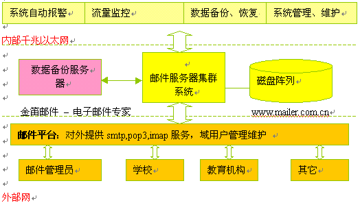 本方案是根據(jù)沈陽教育信息中心對電子郵件系統(tǒng)大容量、高擴(kuò)展性、分級管理的實(shí)際要求,結(jié)合金笛郵件集群系統(tǒng)的技術(shù)特點(diǎn),本著高速穩(wěn)定、易于管理、易于維護(hù)、適度超前的原則,可以作為實(shí)施方案的參考。