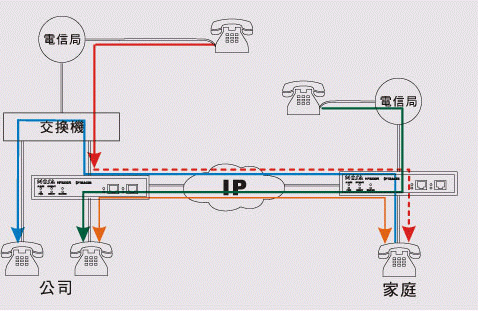 在家里亦可利用公司FONEMOSA遠易通撥出電話及收聽語音信箱 下班后若需處理公務(wù)而需撥打國際或長途電話,裝設(shè)FONEMOSA遠易通之后便可將家里的電話當(dāng)成辦公室分機,舉凡撥接國際或長途電話、其它同仁分機,或者聽取您的語音留言等等都可。若是跨國性企業(yè)在海外有多個據(jù)點,可以在各據(jù)點安裝FONEMOSA遠易通,這樣既便在家里就如同在各據(jù)點上班一樣。(圖標(biāo):On-Net Call 網(wǎng)內(nèi)互打, 橘色線路)