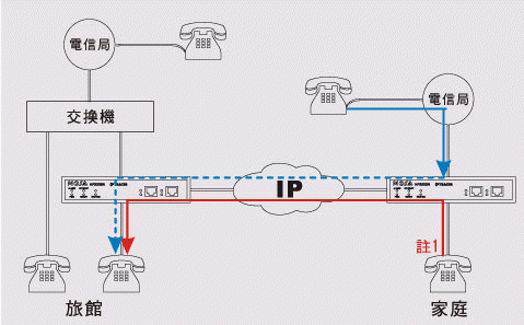 可將家里或辦公室電話轉(zhuǎn)接至所住旅館之FONEMOSA遠易通 將FONEMOSA遠易通在旅館房間裝設(shè)好后,可以設(shè)定將家里或辦公室的 FONEMOSA遠易通電話轉(zhuǎn)至旅館房間,這樣您可以在旅館房間里免費接聽家里或公司的電話。(圖標(biāo):Transit-in Call 轉(zhuǎn)撥入打法 , 藍色線路 )