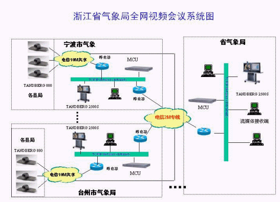 浙江省氣象局為了響應(yīng)全國(guó)氣象系統(tǒng)的號(hào)召,充分利用自己網(wǎng)絡(luò)資源的優(yōu)勢(shì),于2003年初經(jīng)過(guò)系統(tǒng)方案的征集、產(chǎn)品的反復(fù)測(cè)試,最終確定了由華夏科技代理的挪威TANDBERG的視頻終端,并于2003年9月份簽訂了一期采購(gòu)合同,共計(jì)40多套視頻終端。