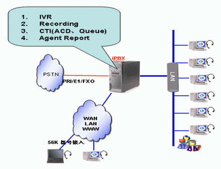 Asterisk IP PBX與相關(guān)板卡結(jié)合就能夠?qū)崿F(xiàn)IP PBX與呼叫中心完美結(jié)合的一體化解決方案。該方案結(jié)合了IP網(wǎng)的靈活性及硬件平臺(tái)自身強(qiáng)大的通信能力、板載資源、媒體處理能力和多種接口等而產(chǎn)生的一種高效、便捷、低成本的應(yīng)用方案。與傳統(tǒng)PBX及IP