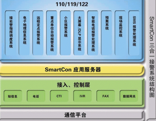 110/119/122等系統(tǒng)和一般企業(yè)的客服系統(tǒng)和熱線系統(tǒng)有一定的共性,但它們肩負(fù)著保障社會安定和人民生命財產(chǎn)安全的重任,這些決定了該系統(tǒng)的特殊性,使它有別于其他行業(yè)的應(yīng)用。我們公司依托雄厚的技術(shù)開發(fā)力量,結(jié)合多年來在公安/消防/交通領(lǐng)域豐富的系統(tǒng)研發(fā)實(shí)施經(jīng)驗(yàn)積累,面向未來的發(fā)展,提出了以SmartCon呼叫中心平臺為核心的三體合一的、綜合的整體解決方案。該解決方案充分考慮到公安/消防/交通系統(tǒng)的現(xiàn)在和未來的發(fā)展趨勢,110/119/122三個系統(tǒng)既可分開單獨(dú)處理報警事務(wù),也可整體考慮、整體調(diào)度。該解決方案涵蓋了電話報警、SMS報警、接處警指揮調(diào)度、電子地理信息系統(tǒng)(GIS)、現(xiàn)場監(jiān)視以及小區(qū)報警雄等等,各個子系統(tǒng)之間相對獨(dú)立,用戶可以根據(jù)實(shí)際要求,進(jìn)行自由搭配,充分體現(xiàn)了系統(tǒng)的靈活性。