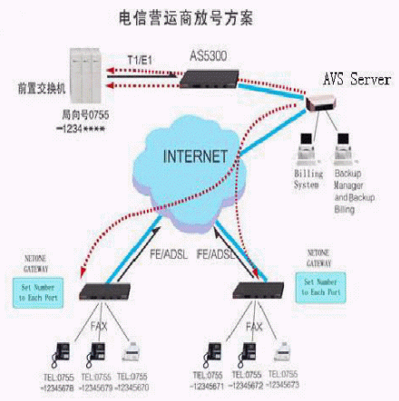 電信運(yùn)營(yíng)商放號(hào)方案采用寬帶數(shù)據(jù)網(wǎng)絡(luò)接入到運(yùn)營(yíng)商,IP電話數(shù)據(jù)流通過(guò)寬帶數(shù)據(jù)網(wǎng)絡(luò)接入運(yùn)營(yíng)商的局端網(wǎng)關(guān)設(shè)備,或者直接進(jìn)入IP電話網(wǎng)絡(luò)。與傳統(tǒng)的電話相比,電信運(yùn)營(yíng)商放號(hào)方案不需要太多的額外投資購(gòu)買(mǎi)硬件設(shè)備;只需在用戶端安裝NETONE語(yǔ)音網(wǎng)關(guān)或IP電話機(jī),話吧、網(wǎng)吧、企業(yè)網(wǎng)用戶、校園網(wǎng)用戶及個(gè)人用戶就可以在現(xiàn)有的網(wǎng)絡(luò)基礎(chǔ)上實(shí)現(xiàn)IP電話放號(hào)服務(wù)。