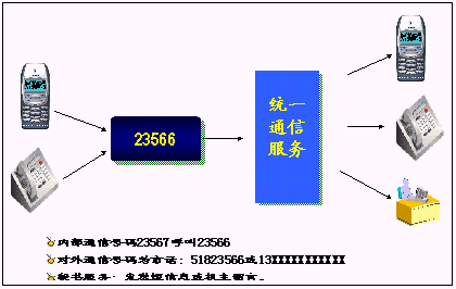 鐵路內(nèi)部員工可以統(tǒng)一所有的通信工具,只使用一個號碼,一次呼叫便可以完成通信,使通信更加簡單、可靠?梢詫崿F(xiàn)換機換網(wǎng)不換號,用戶獲得一個終身的聯(lián)系號碼,用戶無論更換任何通信工具,聯(lián)系號碼和方式不會改變。例如:在路局領(lǐng)導找下屬的時候,只需要撥打他的統(tǒng)一號碼,便可以直接找到他。不必考慮他是否在外出還是在辦公室,是否更換了手機號碼。統(tǒng)一號碼就像他員工號碼,始終不變,即撥即通!