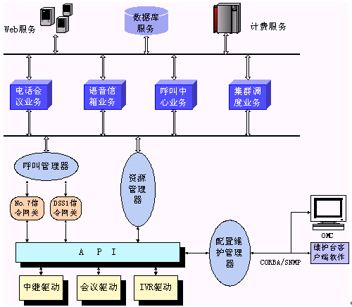 。。該平臺(tái)系統(tǒng)容量大,平滑擴(kuò)容能力強(qiáng);接口和信令豐富,組網(wǎng)能力強(qiáng);資源豐富,業(yè)務(wù)承載能力強(qiáng);技術(shù)工藝先進(jìn),系統(tǒng)穩(wěn)定可靠;CORBA接口易用,二次開(kāi)發(fā)容易,是構(gòu)筑各種CTI應(yīng)用的理想平臺(tái)。