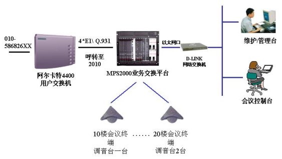 該會議系統(tǒng)通過4個數(shù)字中繼,與國電原有的阿爾卡特4400用戶交換機互連,通信采用Q.931信令。4路4線實現(xiàn)會議終端的接入,現(xiàn)使用3路,1路接國電10樓的調(diào)音臺,2路接20樓的調(diào)音臺,實現(xiàn)會議室擴音設(shè)備的接入。通過以太網(wǎng)口與D-LINK網(wǎng)絡(luò)交換機互連,接入國電集團(tuán)的局域網(wǎng),實現(xiàn)維護(hù)管理及會議控制等功能。國電集團(tuán)的會議接入號為:010-586826XX,因原有交換機的功能局限,以該接入號到交換機后自動呼轉(zhuǎn)到2010進(jìn)入MPS2000會議系統(tǒng),實現(xiàn)會議的呼入。