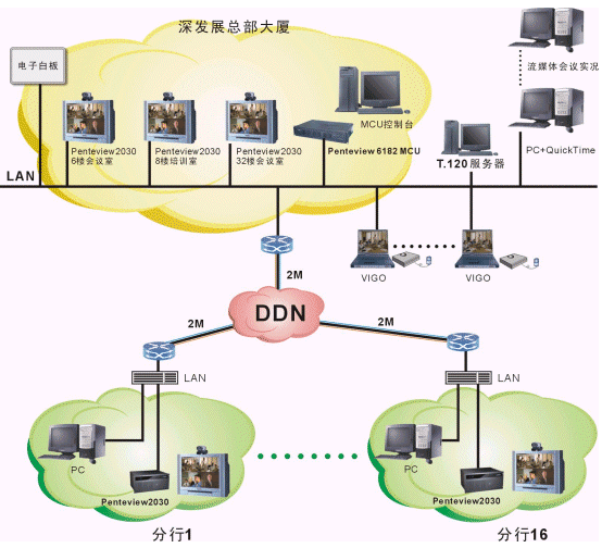 整個(gè)深圳發(fā)展銀行會(huì)議電視系統(tǒng)組網(wǎng)分為兩級(jí),中心點(diǎn)3套Penteview2030到下面的16個(gè)異地的分支行。深圳發(fā)展銀行大廈6樓大會(huì)議室、培訓(xùn)小會(huì)議室、32樓會(huì)議室作為主會(huì)議室,在6樓的機(jī)房中放置主MCU和一個(gè)終端,培訓(xùn)小會(huì)議室放置一個(gè)終端,其他16個(gè)異地分支行分別放置一臺(tái)Penteview2030終端,通過(guò)現(xiàn)有的深發(fā)展DDN網(wǎng)絡(luò)相互連通。根據(jù)深發(fā)展通信網(wǎng)絡(luò)結(jié)構(gòu)及傳輸容量的實(shí)際情況,會(huì)議電視系統(tǒng)采用星型拓?fù)溥B接,各地可通過(guò)現(xiàn)有的DDN專線劃出768K-2M的帶寬,進(jìn)行視頻會(huì)議的方式組建起多點(diǎn)會(huì)議電視系統(tǒng)。提供的方案為:MCU選擇支持H.323的MCU Penteview 6180,終端采用支持H.323的Penteview 2030;
