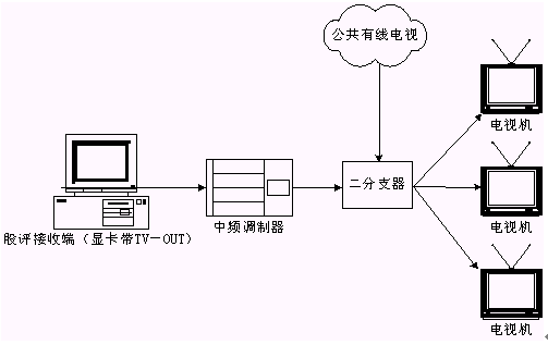 本系統(tǒng)接收端接收實(shí)時(shí)廣播時(shí),除了用普通PC機(jī)收看,或把PC機(jī)接收到的信號(hào)輸?shù)诫娨暎ù笃粒┥鲜湛矗踔吝可以接入有線電視網(wǎng)進(jìn)行播放。具體方法是通過一個(gè)接收端接收股評(píng)節(jié)目,通過帶TV-OUT的顯卡把TV信號(hào)輸出到中頻調(diào)制設(shè)備,中頻調(diào)制設(shè)備可以把基帶模擬信號(hào)轉(zhuǎn)換成一個(gè)有線電視信號(hào),且傳輸距離遠(yuǎn),損失小,再把這個(gè)信號(hào)與有線電視信號(hào)一起接入一個(gè)二分支器(2進(jìn)1出),這就可以和公共有線電視共存,形成自己的頻道,供電視接收。