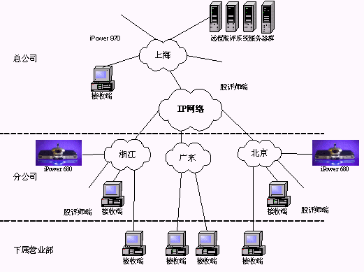 某證券公司有三級(jí)網(wǎng)絡(luò),總公司、分公司和下屬營(yíng)業(yè)部。總公司到分公司帶寬是2M,在總公司配置一套會(huì)議室型電視會(huì)議終端POLYCOM 970和一套多點(diǎn)會(huì)議服務(wù)器Radvision ViaIP400。在分公司配置了38套會(huì)議室型電視會(huì)議終端POLYCOM 680,用于與總公司進(jìn)行雙向視頻會(huì)議。分公司到營(yíng)業(yè)部帶寬是512K,各營(yíng)業(yè)部安裝遠(yuǎn)程股評(píng)系統(tǒng)接收端程序,遠(yuǎn)程股評(píng)系統(tǒng)服務(wù)器都放置在海通總公司。當(dāng)在總公司進(jìn)行股評(píng)時(shí),總公司本地?cái)z像頭拍攝教師畫面,MIC采集教師聲音,傳給服務(wù)器編碼,再通過網(wǎng)絡(luò)供各個(gè)接收端接收;當(dāng)在分公司進(jìn)行股評(píng)時(shí),首先分公司的電視會(huì)議設(shè)備采集教師畫面及聲音傳回總公司的電視會(huì)議設(shè)備,再傳給遠(yuǎn)程股評(píng)系統(tǒng)的服務(wù)器進(jìn)行編碼,然后通過網(wǎng)絡(luò)發(fā)布,供接收端接收。(結(jié)構(gòu)如下圖)