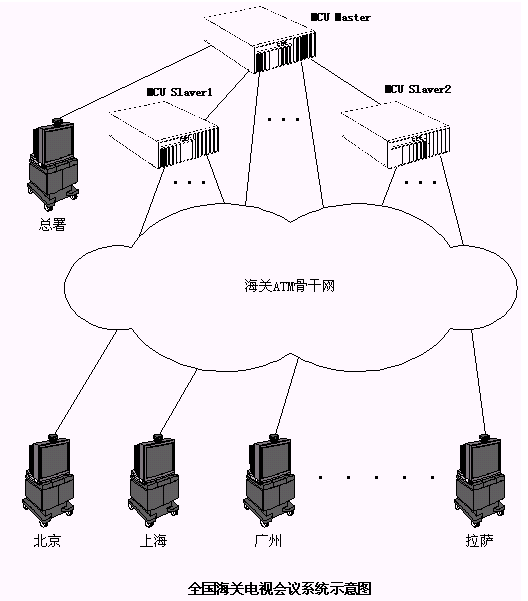 與海關(guān)ATM網(wǎng)一樣,海關(guān)電視會議系統(tǒng)也是以總署為中心的星形結(jié)構(gòu)?偸鹋渲糜腥齻相互級連的MCU,其中一個為Master,另外兩個為Slaver,分署和各海關(guān)的會議終端設(shè)備通過ATM網(wǎng)的PVC信道分別連接到Master或Slaver MCU的不同控制端口,形成一個全國性的電視會議系統(tǒng)。