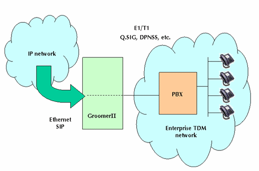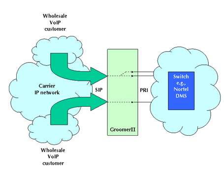 圖1中的GroomerII支持PRI協(xié)議,如:NI-2、ETS300和INS1500等,可以實現(xiàn)網關的功能把運營商自己的電路交換網和IP網絡相互連接在一起。這種設置允許網絡運營商向其他業(yè)務供應商提供批量VoIP業(yè)務。這類業(yè)務運營商據(jù)此可以向他們的客戶提供具有區(qū)分性的業(yè)務,如:利用SIP電話呼叫等。