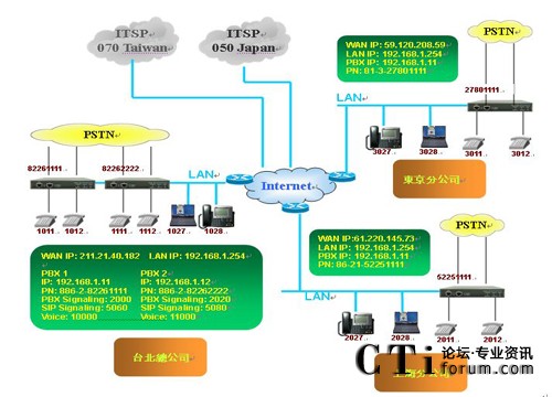 在上圖的架構(gòu)中,各點(diǎn)皆使用MOSA 4604A Plus,皆為2個(gè)FXS、2個(gè)FXO、4個(gè)SIP外線及30個(gè)SIP分機(jī)的型號(hào),F(xiàn)XO接在當(dāng)?shù)氐腜STN(公眾交換電信網(wǎng)絡(luò))上,F(xiàn)XS則接在一般的話機(jī)上,另各有30的SIP分機(jī)可供其它SIP設(shè)備(如SIP
