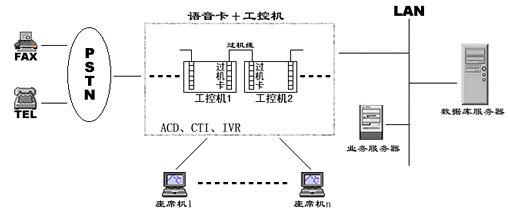 在一些小型CALL CENTER系統(tǒng)中,人們通常通過語音板卡加工控機(jī)的方式搭建系統(tǒng),通常一臺(tái)設(shè)備就集成了ACD、IVR、CTI等各種資源,各資源的使用、調(diào)派通過軟件進(jìn)行控制,有效的解決了建設(shè)成本高、系統(tǒng)構(gòu)造繁復(fù)的問題,具有相當(dāng)?shù)撵`活性。然而由于工控機(jī)和語音板卡容量有限,同時(shí)其標(biāo)準(zhǔn)最多只能是工業(yè)級(jí)標(biāo)準(zhǔn),因此在構(gòu)建相對(duì)大型的呼叫中心時(shí)就總是捉襟見肘。為了增加系統(tǒng)容量,解決多臺(tái)PC之間進(jìn)行通道交換的難題,人們又設(shè)計(jì)了過機(jī)卡和過機(jī)線來解決,其應(yīng)用系統(tǒng)如下圖: