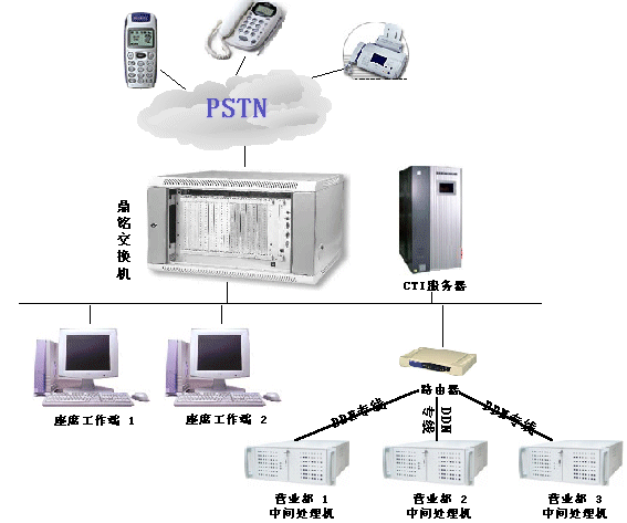 該系統(tǒng)總體來說就是,在一個地域中,相對集中的若干個營業(yè)部實行集中分布式統(tǒng)一管理,系統(tǒng)采用統(tǒng)一中繼號碼接入,支持現(xiàn)有的模擬線路、數(shù)字線路(中國一號信令、七號信令),實現(xiàn)統(tǒng)一座席管理,即所有座席功能集中在技術力量和業(yè)務力量較強的營業(yè)部或總部。