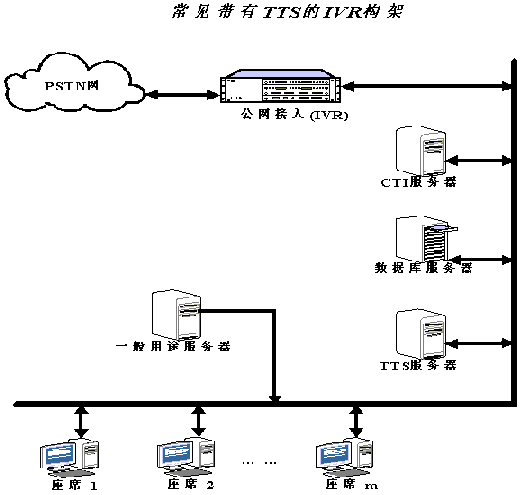 在一般的CTI應(yīng)用系統(tǒng)中,都會(huì)有IVR(交互式語(yǔ)音應(yīng)答系統(tǒng))。IVR系統(tǒng)是呼叫中心的重要組成部分,通過(guò)IVR系統(tǒng),用戶可以利用音頻按健電話輸入信息,從系統(tǒng)中獲得預(yù)先錄制的數(shù)字或合成語(yǔ)音信息。具有TTS功能的IVR可以加快服務(wù)速度,節(jié)約服務(wù)成本,使IVR為呼叫者提供7*24小時(shí)的服務(wù)。