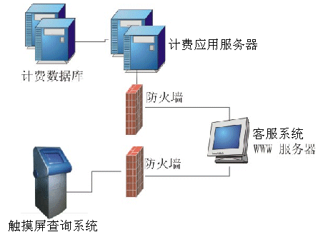 。。觸摸屏查詢系統(tǒng)通過WWW方式訪問鐵通客服系統(tǒng)的WEB服務(wù)器,再由WEB服務(wù)器訪問計(jì)費(fèi)系統(tǒng)的應(yīng)用服務(wù)器,由應(yīng)用服務(wù)器上的代理訪問計(jì)費(fèi)系統(tǒng)的數(shù)據(jù)庫。由于觸摸屏查詢系統(tǒng)與客服系統(tǒng)WEB服務(wù)器之間、客服系統(tǒng)WEB服務(wù)器與計(jì)費(fèi)應(yīng)用服務(wù)器每層都有網(wǎng)絡(luò)防火墻進(jìn)行隔離,同時(shí)客服系統(tǒng)的WEB服務(wù)器并不直接訪問計(jì)費(fèi)數(shù)據(jù)庫,因此可以保證計(jì)費(fèi)系統(tǒng)的數(shù)據(jù)安全。在觸摸屏上用戶除了訪問系統(tǒng)提供的功能以外,不能做任何操作,再次保證了系統(tǒng)的安全可靠。
