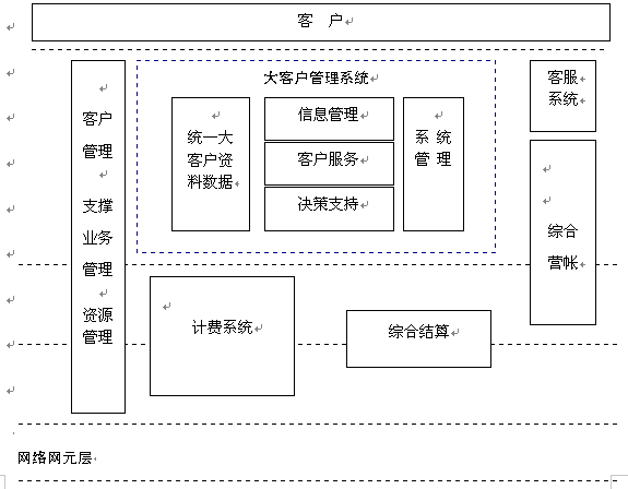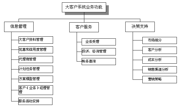 電信大客戶管理系統(tǒng)是在收集大客戶市場調(diào)查信息、大客戶資料信息、大客戶經(jīng)營戰(zhàn)略資源的基礎(chǔ)上,自動(dòng)采集專業(yè)計(jì)費(fèi)、綜合營帳、客服、網(wǎng)管、財(cái)務(wù)等系統(tǒng)的相關(guān)數(shù)據(jù),實(shí)現(xiàn)快速、全面、準(zhǔn)確的新客戶業(yè)務(wù)受理、新增需求受理及故障處理過程通道,實(shí)現(xiàn)完善的客戶經(jīng)理管理、代理商管理系統(tǒng),最終實(shí)現(xiàn)完整的大客戶滿意度評估體系和針對大客戶的個(gè)性化服務(wù)。建成后的系統(tǒng)從管理、服務(wù)、分析三方面出發(fā)主要應(yīng)具備信息管理、客戶服務(wù)、決策支持功能。