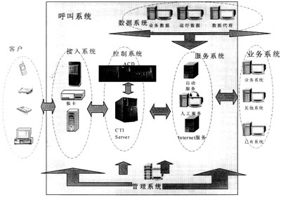 根據(jù)平臺與業(yè)務系統(tǒng)相分離的設計原則,AnyTouch系統(tǒng)由呼叫系統(tǒng)和業(yè)務系統(tǒng)兩部分組成。在呼叫系統(tǒng)中,CTI Server和ACD Server是整個系統(tǒng)的核心,因為任何一個呼叫的生命周期都存在于CTI Server中,而ACD Server提供控制每個呼叫下一步活動的智能排隊算法服務。