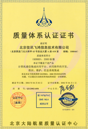 經(jīng)過近半年時(shí)間的建立和保持質(zhì)量體系運(yùn)行,佳訊飛鴻于在2002年3月順利的通過為期三天的嚴(yán)格審核,并重點(diǎn)對佳訊公司核心技術(shù)的CTI平臺(tái)進(jìn)行審核。2002年4月2日通過了ISO國際組織的新體系標(biāo)準(zhǔn)ISO9001:2000的體系認(rèn)證,取得了通過該標(biāo)準(zhǔn)的認(rèn)證證書。佳訊飛鴻公司也成為國內(nèi)第一家對CTI平臺(tái)進(jìn)行審核并通過認(rèn)證的公司。其完成標(biāo)志著公司從成立之時(shí)起即嚴(yán)格遵循國際企業(yè)標(biāo)準(zhǔn)及現(xiàn)代企業(yè)管理模式,以軟件產(chǎn)品質(zhì)量管理體系為載體,以客戶需求為導(dǎo)向。全面提高產(chǎn)品、服務(wù)質(zhì)量,順應(yīng)不斷變化的技術(shù)發(fā)展方向和市場變化,在質(zhì)量、技術(shù)、成本和交期等方面全力滿足客戶需求,為客戶提供最佳性價(jià)比的產(chǎn)品和服務(wù)。