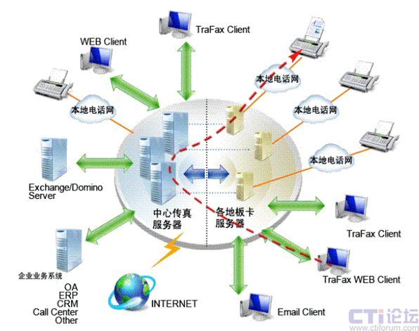 Server板卡服務(wù)器都將通過Internet或企業(yè)網(wǎng)絡(luò)而相互連接起來,協(xié)同工作, 共同分擔(dān)工作負荷, 共享資源和傳真信道。這樣傳真也是被傳遞到離目的地最近的板卡服務(wù)器后才發(fā)送出去,從而將國際,國內(nèi)傳真費用減少為本地傳真費用。