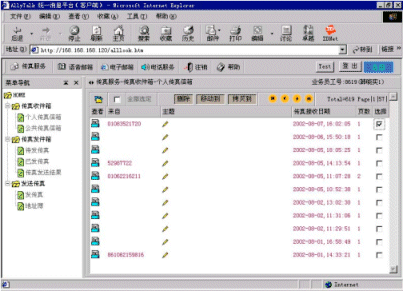 3、系統(tǒng)可以將外部的語音留言、傳真、EMAIL統(tǒng)一提交企業(yè)內部的INTRANET服務器處理,使得職員在同一界面下完成多種任務。