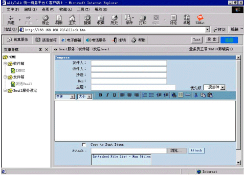 AllyTalk統(tǒng)一消息的電子郵箱具有與Microsoft Exchange或OutLook相同的功能,可以通過設定Email服務的參數(shù),實現(xiàn)公司內部收發(fā)Email,或通過Email服務器實現(xiàn)與Internet的通信;