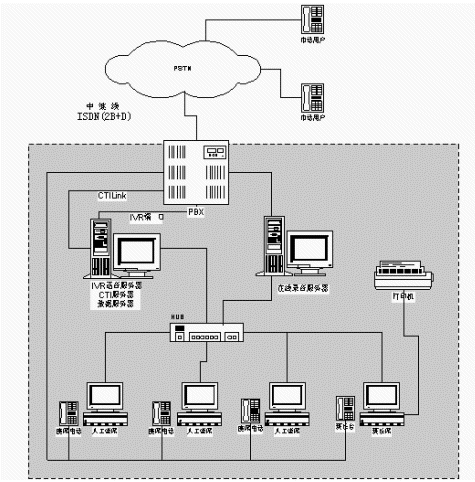 系統(tǒng)目前共設(shè)置了多個(gè)人工座席,每人工座席有電腦一臺(tái),耳機(jī)式電話一部。人工座席的電腦與CTI,IVR語(yǔ)音服務(wù)器及數(shù)據(jù)庫(kù)服務(wù)器共處一個(gè)局域網(wǎng)內(nèi)。