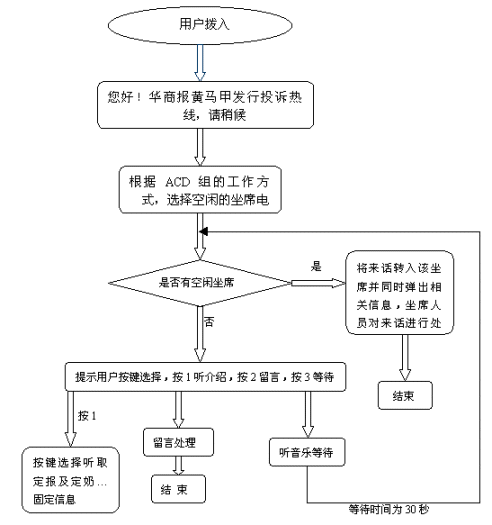 當(dāng)坐席全忙時(shí),IVR流程會(huì)引導(dǎo)用戶按鍵選擇聽(tīng)取介紹、留言及聽(tīng)音樂(lè)等待,用戶可按鍵選擇聽(tīng)取介紹(包括定報(bào)及定奶的信息),聽(tīng)完介紹用戶可按鍵選擇繼續(xù)聽(tīng)介紹或轉(zhuǎn)人工服務(wù);用戶選擇留言時(shí),IVR流程會(huì)提示用戶留下電話及投訴內(nèi)容,有指定的坐席人員每天聽(tīng)取留言并進(jìn)行處理,從而減少了由于話務(wù)量集中而坐席人員無(wú)法及時(shí)處理的投訴電話。用戶選擇等待時(shí)會(huì)聽(tīng)到一段優(yōu)美的音樂(lè),當(dāng)坐席有空閑時(shí)電話會(huì)被及時(shí)的轉(zhuǎn)入坐席由坐席人員進(jìn)行處理。