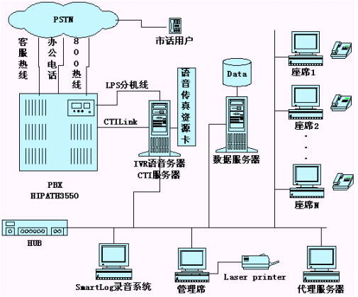 系統(tǒng)是由一臺Siemens HiPath交換機,一臺CTI,IVR語音服務(wù)器,一臺SmartLog錄音監(jiān)聽服務(wù)器構(gòu)成。系統(tǒng)的連接方式如上圖。系統(tǒng)目前共設(shè)置了12個人工座席,根據(jù)業(yè)務(wù)的不同分為寶健之友及代理商座席和專賣門市座席,每個人工座席有電腦一臺,人工座席的電腦與CTI,IVR語音服務(wù)器及數(shù)據(jù)庫服務(wù)器共處一個局域網(wǎng)內(nèi)。