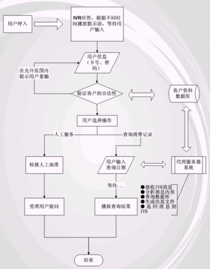 用戶通過客戶服務(wù)熱線呼入呼叫中心系統(tǒng),由通信網(wǎng)關(guān)接入IVR系統(tǒng),進入IVR流程,用戶輸入基本信息,如卡號、密碼等,IVR系統(tǒng)將查詢客戶資料,驗證其合法性,如果是合法會員,IVR系統(tǒng)會以語音合成的方式播報客戶姓名,人性化的設(shè)計盡在其中。用戶可以進一步選擇人工服務(wù)或語音查詢,人工服務(wù)將由UltraCTI呼叫中心服務(wù)器根據(jù)座席的工作狀態(tài)自動將呼叫分配到某一座席,同時將用戶的信息通過TCP/IP網(wǎng)絡(luò)協(xié)議一并發(fā)送,服務(wù)人員接受呼叫,同時自動根據(jù)用戶信息在座席的客戶端彈出受理信息界面?蛻襞c服務(wù)人員在交流的過程中,可以查詢產(chǎn)品信息庫等,當咨詢完畢時,呼叫結(jié)束,座席空閑,等待下一次呼叫。