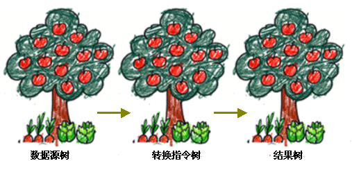 一棵或多棵數(shù)據(jù)源樹(XML數(shù)據(jù)源文件),通過一棵轉換指令樹(選擇數(shù)據(jù)、表達數(shù)據(jù)表現(xiàn)形式的模板文件),獲得了一棵結果樹(圖表、報表)。