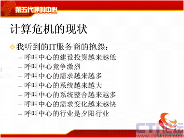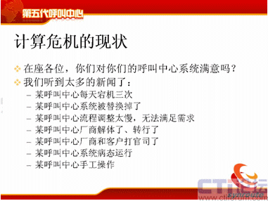 呼叫中心現(xiàn)在已經(jīng)了比較嚴(yán)重的計(jì)算危機(jī),我聽(tīng)到了很多,因?yàn)槲抑攸c(diǎn)是在搞技術(shù)這一行當(dāng),我就問(wèn)一個(gè)問(wèn)題,在座的各位,你們對(duì)你們的呼叫系統(tǒng)滿意嗎?我相信大部分人可能嘴上都說(shuō)比較滿意,但是很多人對(duì)深層次的矛盾都非常清楚,為什么不滿意?