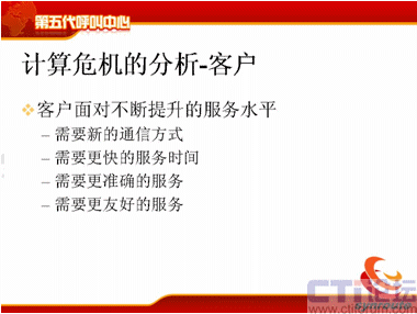 我分析一下計(jì)算的危機(jī),計(jì)算危機(jī)來(lái)源于三個(gè)方面,第一是客戶面對(duì)不斷提升的服務(wù)水平,現(xiàn)在需要新的通信方式,包括電話、傳真、短信、電子郵件等等,還包括網(wǎng)上的護(hù)航瀏覽,表單共享,電子排版等等通信方式。第二方面需要更快的服務(wù)時(shí)間,80%的電話是20秒接起,可是短信的響應(yīng)時(shí)間為什么這么長(zhǎng),需要更準(zhǔn)確的服務(wù),電話的服務(wù)是什么樣的,我現(xiàn)在需要網(wǎng)上交談的服務(wù)質(zhì)量也能夠得到保障等等,這是客戶對(duì)IT服務(wù)者提供的壓力。