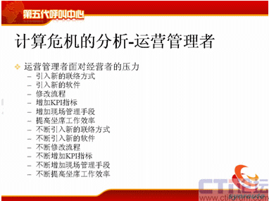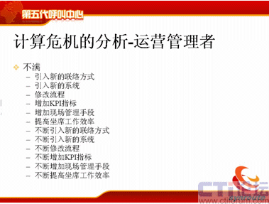 計(jì)算危機(jī)的下一方面是運(yùn)營(yíng)管理者,可能在座很多人是做運(yùn)營(yíng)管理的,你們會(huì)不斷去跟IT服務(wù)者提需求,我下一個(gè)月想引進(jìn)新的聯(lián)絡(luò)方式,下個(gè)月我想引進(jìn)新的軟件,引進(jìn)新的流程,我想增加KPI指標(biāo),我想增加現(xiàn)場(chǎng)的管理手段,我想提高座席的工作效率,后面也是不斷的,不斷地去引入新的聯(lián)絡(luò)方式。