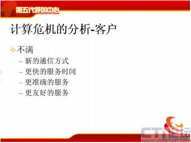 現(xiàn)在我們就分析一下后果,這時(shí)候計(jì)算危機(jī)的分析對(duì)于客戶來(lái)說(shuō),新的通訊方式我們都需要,可是呼叫中心沒(méi)有公布,我無(wú)法使用,更快的服務(wù)時(shí)間,大家看到了,比如說(shuō)Web Chat,目前我點(diǎn)擊了80%是直接進(jìn)入留言的頁(yè)面,也就是說(shuō)這時(shí)候沒(méi)有人工來(lái)服務(wù)了,或者是等待時(shí)間非常非常長(zhǎng),一個(gè)小時(shí)以后告訴我,排隊(duì)已經(jīng)到了,已經(jīng)沒(méi)有人能為我服務(wù)的,服務(wù)時(shí)間是根本沒(méi)有辦法保證的。第三個(gè)方面我們要更準(zhǔn)確的服務(wù),電話打進(jìn)去以后告訴我的信息和網(wǎng)絡(luò)告訴我的信息是完全不一樣的呢?為什么呢?因?yàn)樗闹R(shí)庫(kù)沒(méi)有關(guān)聯(lián)起來(lái),業(yè)務(wù)流程沒(méi)有關(guān)聯(lián)起來(lái),這種更友好的服務(wù),考核的指標(biāo)都是一樣的。