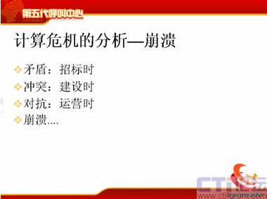 我把第五代呼叫中心的概念詳細(xì)地論述一下。主要是分成五個(gè)部分,第一個(gè)是第五代呼叫中心的定義;第二個(gè)計(jì)算危機(jī)的現(xiàn)狀;第三是計(jì)算危機(jī)的分析;第四第五代呼叫中心;第五是結(jié)論——迎接第五代呼叫中心的挑戰(zhàn)。