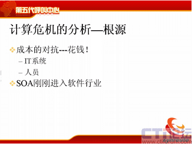 我們分析這個(gè)根源,根源其實(shí)就是錢的問(wèn)題,昨天我聽(tīng)了遠(yuǎn)傳的Bill的講座,講得非常精彩,而且非常幽默,他在整個(gè)講的過(guò)程中,不斷地提一個(gè)次,提了30多次,說(shuō)是“很花錢”呀,“太花錢”了,“很花錢”。確實(shí)是很花錢,呼叫中心是一個(gè)燒錢的中心,這是他的理論,其實(shí)我的想法也是一樣的。那么對(duì)于IT系統(tǒng)來(lái)說(shuō),確實(shí)需要花很多錢,現(xiàn)在的系統(tǒng)大家想想系統(tǒng)要么和CRM對(duì)接,要么和ERP對(duì)接,有的和供應(yīng)鏈對(duì)接,有的和人力資源管理對(duì)接,有的和業(yè)務(wù)核心系統(tǒng)對(duì)接。那么人員上也是很花錢的,對(duì)于外包呼叫中心來(lái)說(shuō),客戶服務(wù)200座席左右的,人工的成本占到了75%,這個(gè)成本是非常高的,確實(shí)是很花錢。那么剛才也說(shuō)了,剛才那些需求,短信的需求,大家看雖然很復(fù)雜,如果給我一千萬(wàn)的話,我能輕松地把它搞定,給我一年的時(shí)間,但這是不現(xiàn)實(shí)的。解決的辦法有嗎?有,SOA。SOA是現(xiàn)在軟件行業(yè)一直在做的一件事情,是公認(rèn)的標(biāo)準(zhǔn),但是它剛剛進(jìn)入中國(guó),而且還都沒(méi)有進(jìn)入呼叫中心。