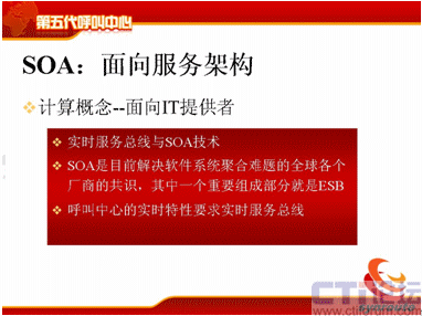 SOA就是面向服務(wù)的架構(gòu),這個(gè)概念近兩、三年來(lái)在中國(guó)的發(fā)展是比較快的,計(jì)算的概念,它是面向IT提供者。實(shí)時(shí)服務(wù)總線技術(shù)與SOA,SOA是目前解決軟件系統(tǒng)聚合難題的全球各個(gè)廠商的共識(shí),其中一個(gè)重要的概念是ESB,不知道大家清楚嗎?就是企業(yè)服務(wù)總線,是SOA里面重要的組成部分,呼叫中心的實(shí)時(shí)特性要求,這個(gè)服務(wù)總線不是普通的服務(wù)總線,而是實(shí)時(shí)的服務(wù)總線。