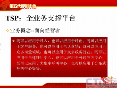TSP這個(gè)概念其實(shí)比較清晰,比較簡(jiǎn)單,它的意思就說(shuō)對(duì)于呼叫中心來(lái)說(shuō),它能支持各種業(yè)務(wù),既可以支持呼入,也可以支持呼出;既可以應(yīng)用于客戶服務(wù),也可以應(yīng)用于電話營(yíng)銷;既可以應(yīng)用于商業(yè)領(lǐng)域,也可以應(yīng)用于政務(wù)領(lǐng)域;既可以用于自建,也可以用于外包;可以是大規(guī)模集中的,也可以是分布式的。
