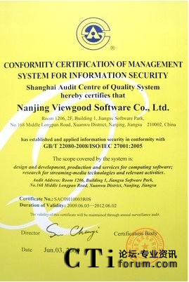 CTI論壇(ctiforum)07月17日消息: 日前,VIEWGOOD順利通過ISO27001信息安全管理體系國際認(rèn)證,成為首家通過該項(xiàng)認(rèn)證的專業(yè)流媒體技術(shù)供應(yīng)商。此舉標(biāo)志著VIEWGOOD在保障信息安全、提升企業(yè)管理水平方面,已經(jīng)全面接軌國際水平,并居于業(yè)內(nèi)領(lǐng)先地位。