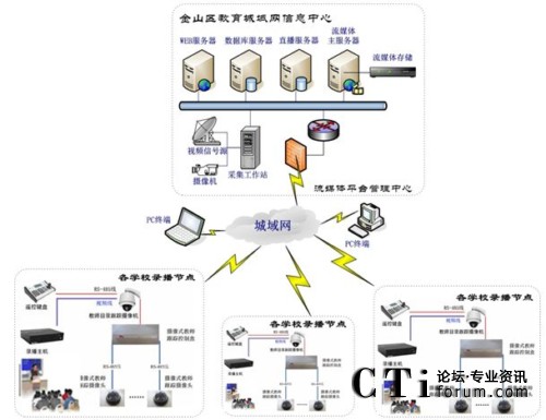 流媒體平臺采用分布式架構(gòu)部署,分為web服務(wù)器,數(shù)據(jù)庫服務(wù)器、直播服務(wù)器和流服務(wù)器,如有必要可在信息中心架設(shè)采集工作站搭建網(wǎng)絡(luò)電視或?qū)崨r直播應(yīng)用,在各個學(xué)校已經(jīng)部署錄播系統(tǒng)或直播系統(tǒng)的教室配置流媒體功能組件,這樣錄播實況可以實時傳送到流媒體平臺管理中心的全局直播服務(wù)器上,同時錄播的學(xué)校本色課件也可以上傳存儲到金山區(qū)教育局信息中心的流存儲服務(wù)器上,方便今后的檢索、點播、評估等各種應(yīng)用。