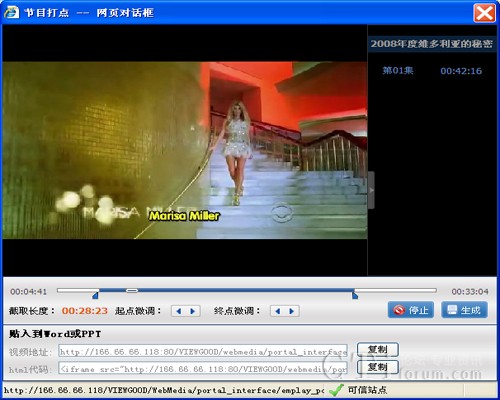 拖動(dòng)進(jìn)度條左右的打點(diǎn)按鈕可以設(shè)定片段的開始和結(jié)束時(shí)間點(diǎn),還可以點(diǎn)擊起點(diǎn)微調(diào)和重點(diǎn)微調(diào)的左右箭頭對截取的視頻進(jìn)行微調(diào),然后點(diǎn)擊“生成”,再點(diǎn)擊“復(fù)制”可以將截取的節(jié)目URL粘貼到WORD、PPT、BBS或BLOG等頁面中。