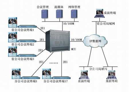 該系統(tǒng)基于蘇州科達公司KDV系列視頻會議產(chǎn)品,全網(wǎng)采用1套MCU、20套會議室型終端和200多套桌面型終端,其中會議室型終端通過2條E1線路捆綁與MCU相連、桌面型終端通過10/100M以太網(wǎng)和IP數(shù)據(jù)網(wǎng)與MCU相連?傮w網(wǎng)絡結(jié)構(gòu)如下圖所示: