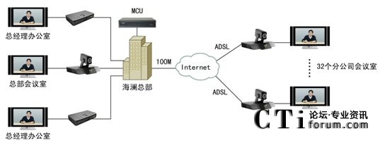2009年6月,領(lǐng)先的視訊廠(chǎng)商科達(dá)攜TrueSens(致勝)視頻會(huì)議系統(tǒng)走進(jìn)海瀾,為海瀾集團(tuán)搭建了一套覆蓋總部2個(gè)領(lǐng)導(dǎo)辦公室、1個(gè)銷(xiāo)售會(huì)議室及全國(guó)32個(gè)分公司的視頻會(huì)議系統(tǒng)。整個(gè)方案在部署上非常便捷,海瀾江陰總部的機(jī)房架設(shè)一臺(tái)高、標(biāo)清一體化多點(diǎn)控制單元(MCU),銷(xiāo)售會(huì)議室、集團(tuán)王總、陶總的辦公室以及海瀾集團(tuán)在全國(guó)的32個(gè)分公司銷(xiāo)售會(huì)議室則各部署一套視頻會(huì)議終端。總部帶寬為100M,分支機(jī)構(gòu)則均通過(guò)普通ADSL接入。系統(tǒng)拓?fù)鋱D如下: