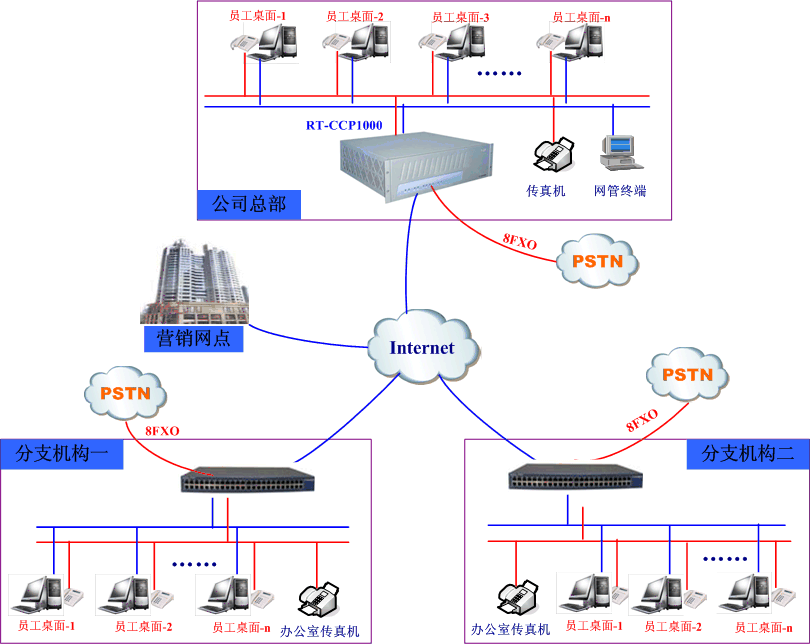 生產(chǎn)總部與分支機(jī)構(gòu)、營(yíng)銷網(wǎng)點(diǎn)實(shí)現(xiàn)統(tǒng)一辦公電話功能(即VOIP組網(wǎng)+辦公電話功能)。
