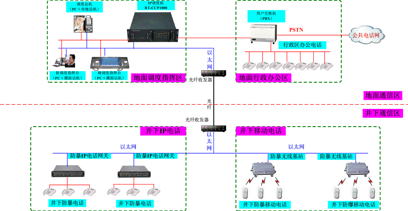 在傳統(tǒng)調(diào)度技術基礎上完美的將固話網(wǎng)絡、IP網(wǎng)絡、無線網(wǎng)絡充分融合,可以實現(xiàn)井上調(diào)度指揮區(qū)及井上行政辦公區(qū)、井下IP電話及井下移動電話的互通,也能提供接口與原有的行政辦公電話無縫整合。同時也完美的解決了不同網(wǎng)絡之間、多套系統(tǒng)之間存在兼容性差、共享性差、重復投資、操作復雜等諸多缺陷。